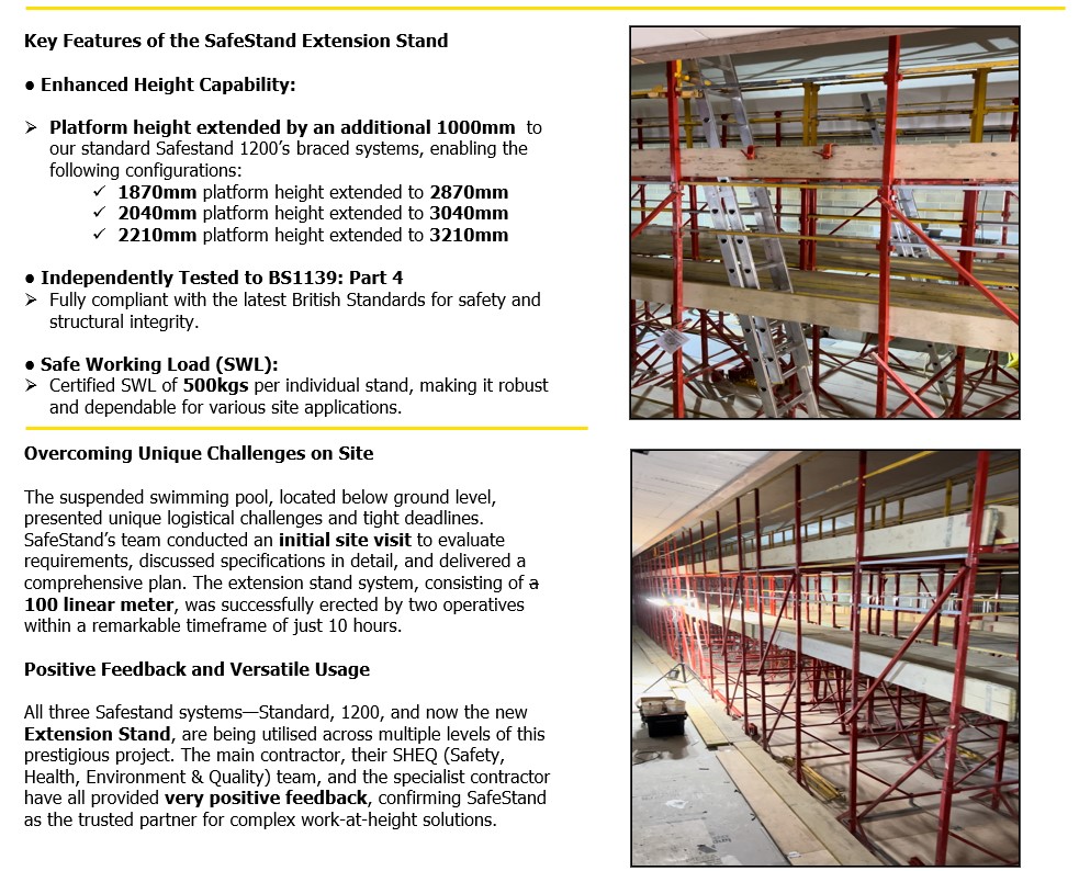 A recent high-profile project in the heart of Mayfair required a cutting-edge work-at-height solution for complex ceiling installations above a suspended underground swimming pool. SafeStand Access Systems rose to the challenge—delivering the ideal answer with our new SafeStand Extension Stand.