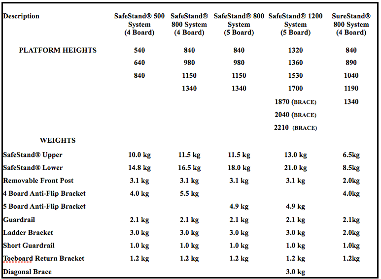 Schedule of SafeStand® Component Weights & Platform Heights